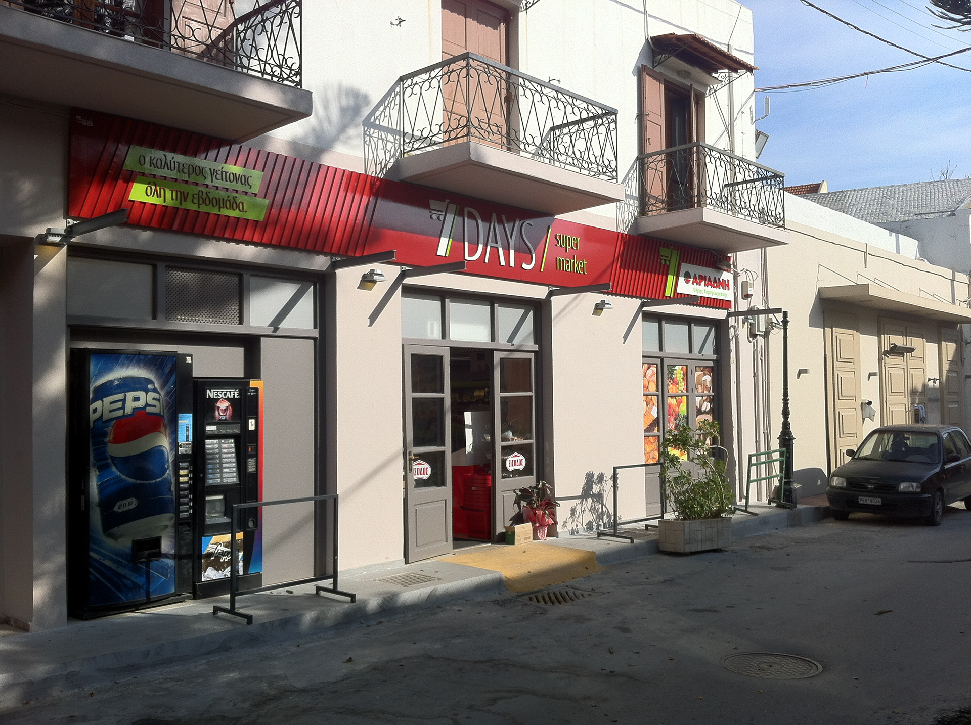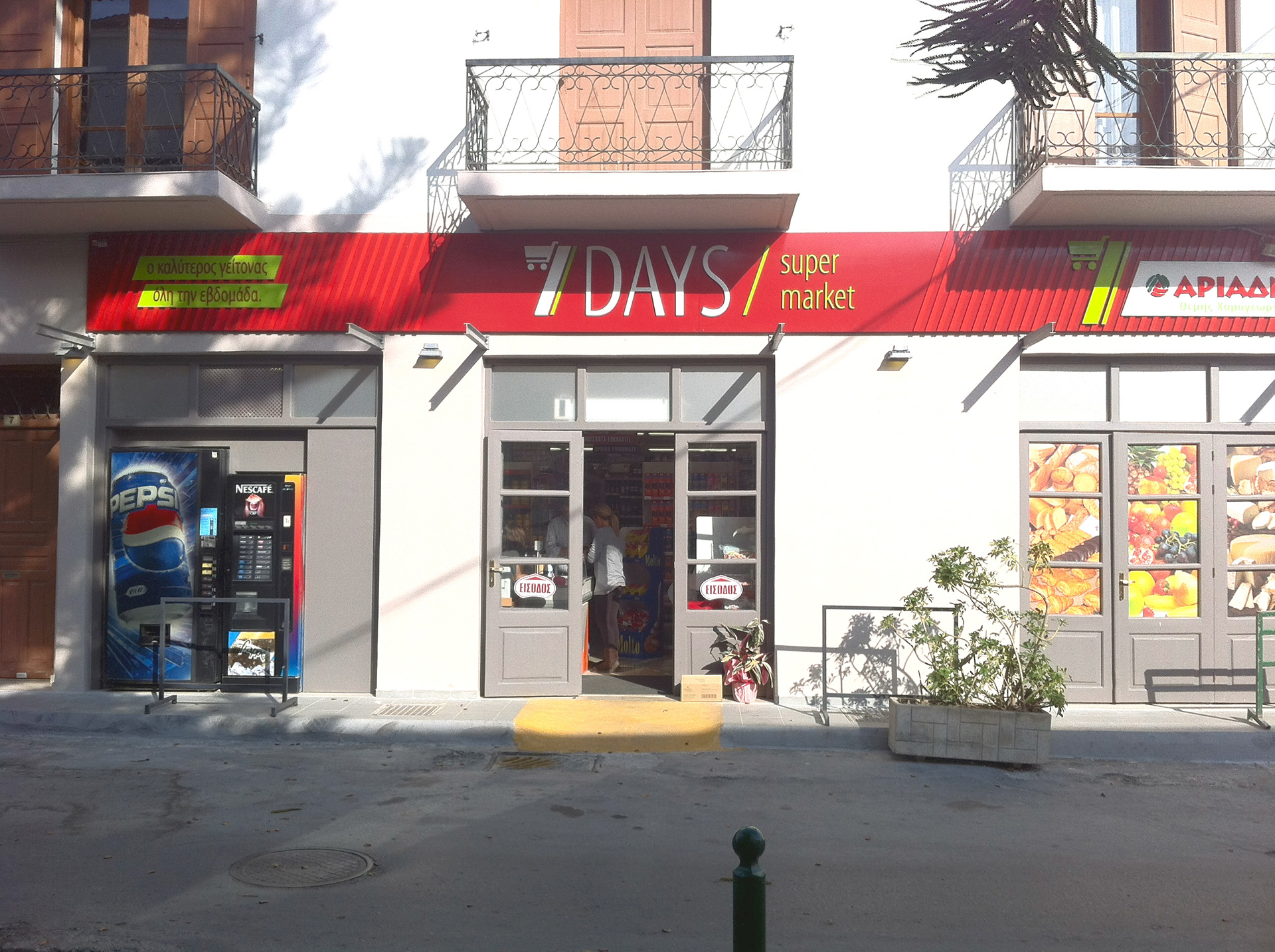 7 Days is a super market located in the heart of the old town of Rethymno in Greece. Since it's location is populated by many tourists, visitors and walkers this sm is open 7 days a week till late at night. It is only one floor so it's kind of fast to get in and out with your stuff quickly. It is operating under the network of suppliers "Ariadni" so color-wise had to maintain some color codes that would relate to them. The symbol "7" is designed in order to present and portray all of the above values and needs so that it could make a stand and be universally understood.